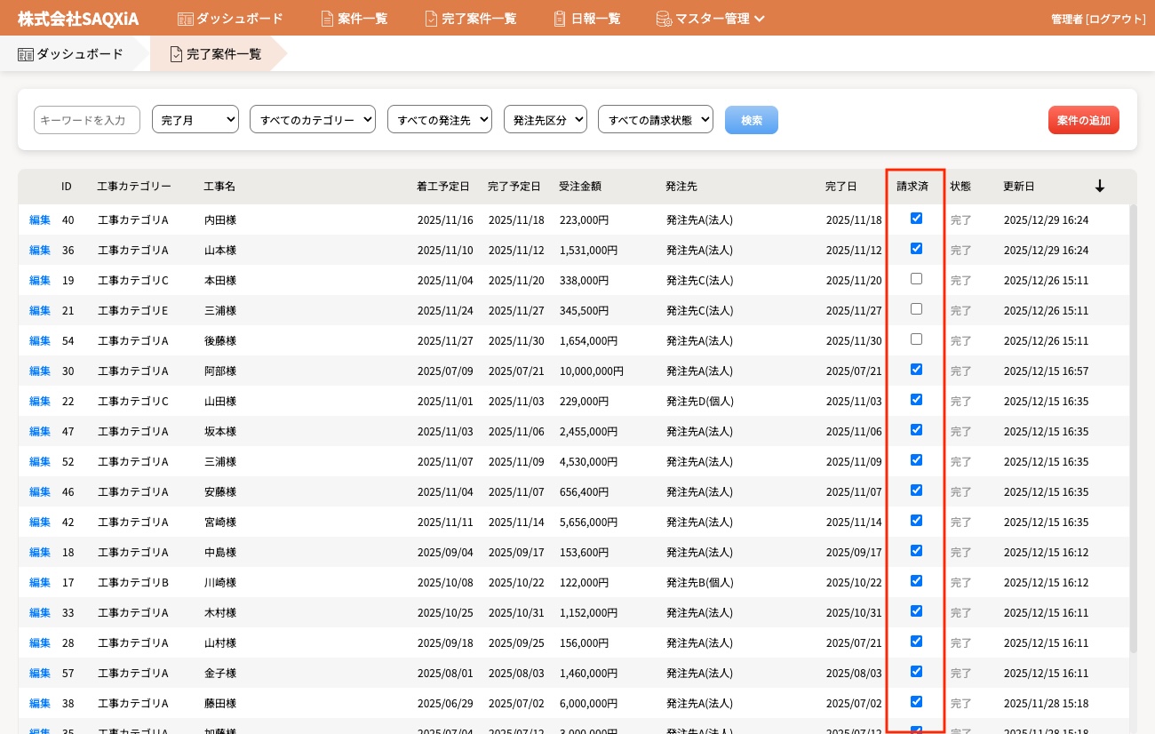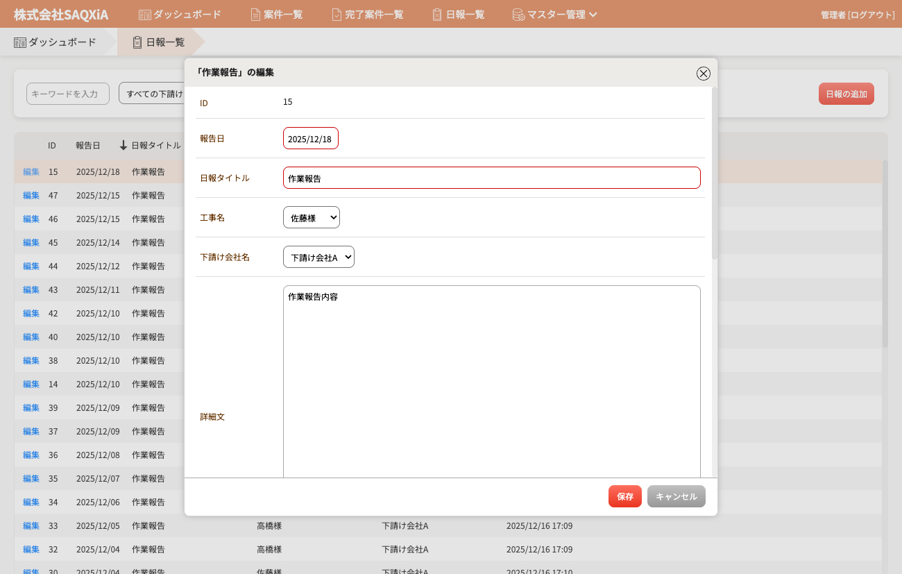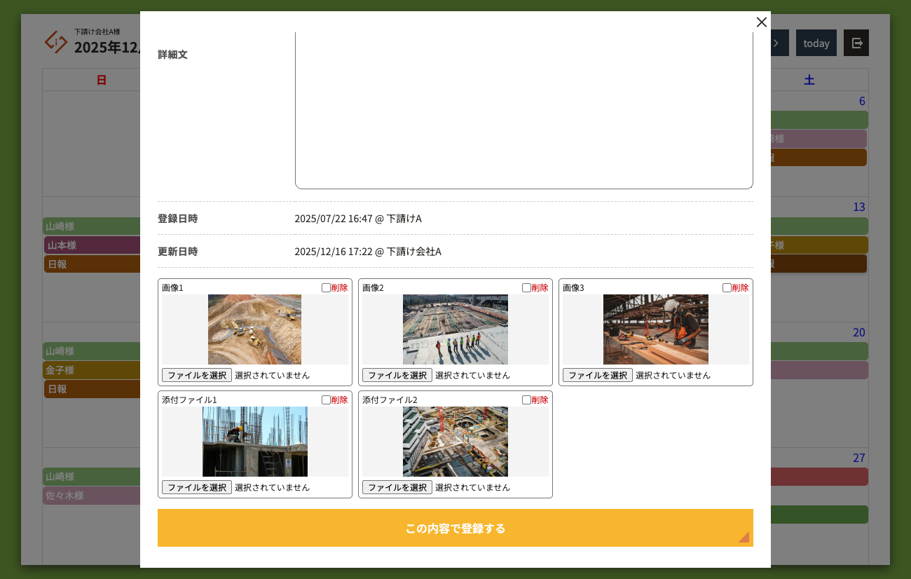 システムはすべてWeb上で管理されているため、事務所からも現場からも同時にアクセスして進捗状況を確認可能。データは常に最新の状態で共有され、情報の行き違いや確認の手間を削減できます。