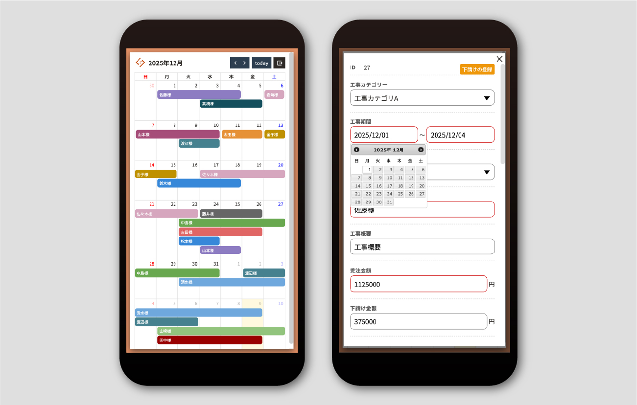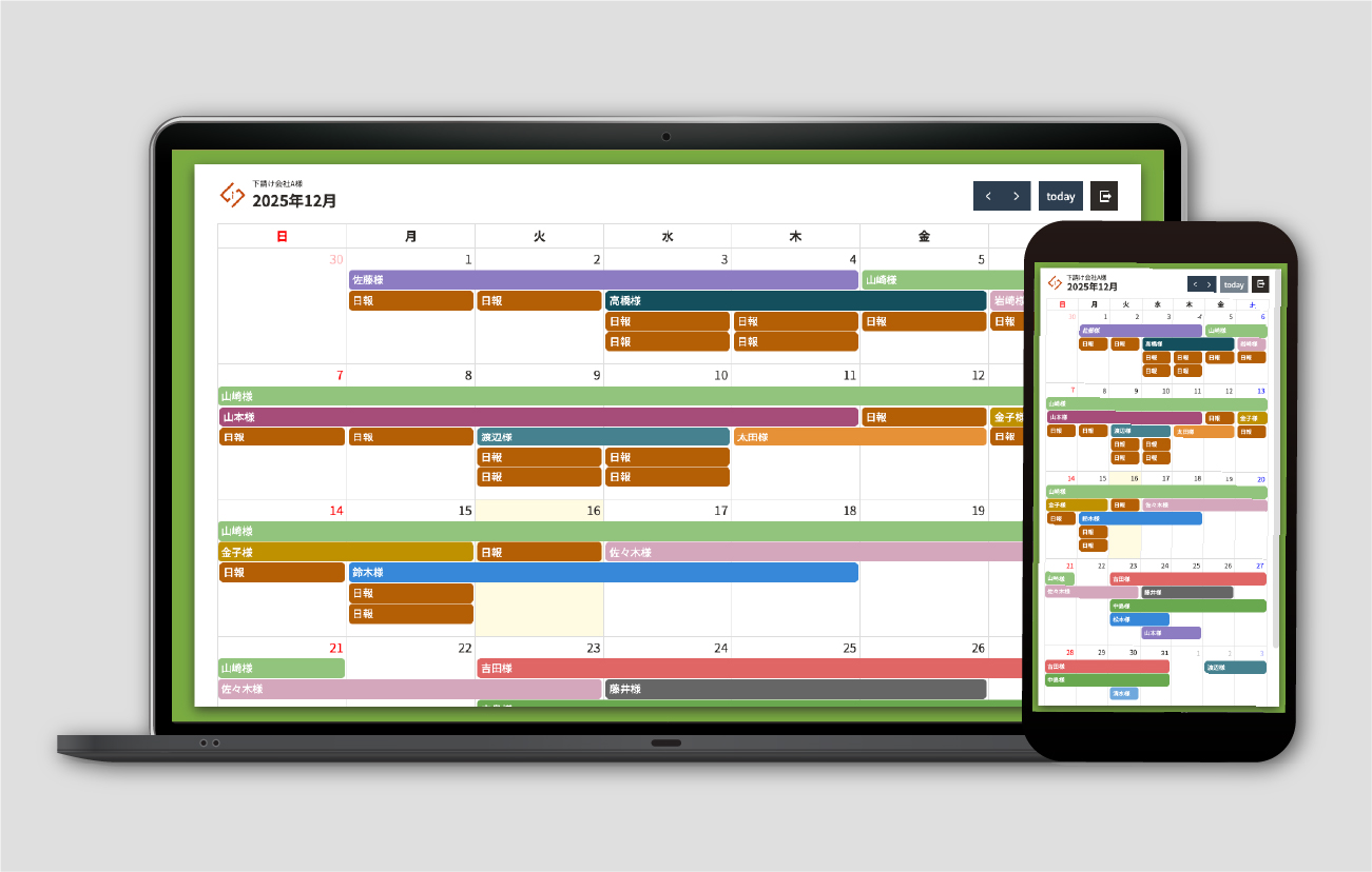 外出先や現場など、パソコンが手元にない状況でも安心して利用可能。スマートフォンから簡単に案件の登録や確認が行えます。移動中やすき間時間でも対応できるので、スピーディーな業務管理が可能です。